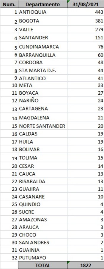 En cuanto a las regiones con más casos reportados, Antioquia lidera con 443 contagiados, seguido de Bogotá con 381 y en tercer lugar Valle con 279.