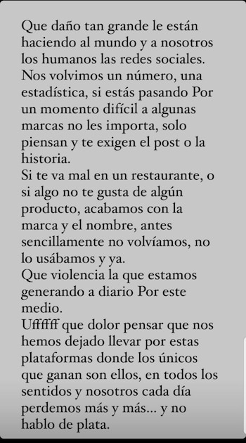 “Qué daño tan grande le están haciendo al mundo y a nosotros los humanos las redes sociales”, inició el mensaje la presentadora, haciendo una crítica a la falta de sensibilidad y empatía por parte de algunas empresas: “Nos volvimos un número, una estadística; si estás pasando por un momento difícil a las marcas no les importa, solo piensan y te exigen el post o la historia”.