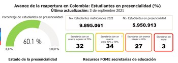 Según el informe, para dinamizar el retorno de los estudiantes del país a las aulas, es importante la ejecución de los recursos asignados por el Fondo de Mitigación de Emergencias FOME a las secretarías de educación para la puesta en marcha de los planes de retorno en las instituciones educativas. El monto asignado por el Fondo fue de $400 mil millones de pesos, de los cuales hasta la fecha se han ejecutado el 79,5% es decir unos $317.911 millones de pesos y faltaría por ejecutar $82.138 millones.