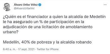 Desde la mañana de este viernes 17 de septiembre, Uribe inició su serie de trinos asegurando que “la alcaldía de Medellín para una venta de un inmueble pidió soborno del 10%, en una reunión estaba el hermano del alcalde. La ciudad con pobreza del 40% y la alcaldía robando”.