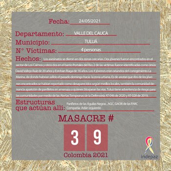 De acuerdo con información del Instituto de Estudios para el Desarrollo de la Paz, Indepaz, esa fue la masacre número 34 en lo corrido del 2021 en Colombia.