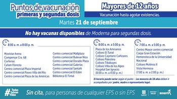 La Secretaría de Salud de Bogotá dio a conocer dónde se encuentran los puntos de vacunación contra el covid-19 habilitados en la capital colombiana para este martes 21 de septiembre, e invitó a la población priorizada, que aún no ha sido contactada por su respectiva EPS, a acercarse para ser inmunizados.