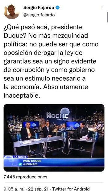 “¿Qué pasó acá, presidente Duque? No más mezquindad política: no puede ser como oposición derogar la ley de garantías sea un signo evidente de corrupción y como gobierno sea un estímulo necesario a la economía. Absolutamente inaceptable”, escribió el precandidato presidencial, que compartió el mensaje junto con un video del mandatario en el que en su pasado critica el argumento que hoy defiende.