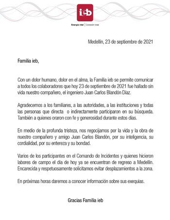 “Agradecemos a los familiares, a las instituciones y a todas las personas que directa o indirectamente participaron en su búsqueda. También a quienes oraron con fe y generosidad en los últimos días. En medio de la profunda tristeza nos regocijamos por la vida y obra de nuestro compañero y amigo Juan Carlos Blandón, por su inteligencia, por su cordialidad, por su entereza y su bondad”, expresó la compañía para la que trabajaba el ingeniero.