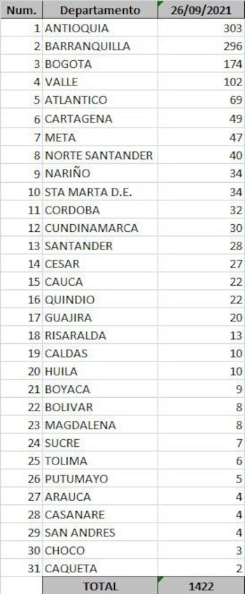 En cuanto a las regiones con más casos reportados Antioquia lidera con 303 contagiados, seguido de Barranquilla con 296 y en tercer lugar Bogotá con 174.