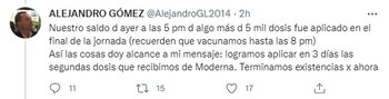 Gómez así mismo anunció a través de su cuenta de Twitter que, desde las 10:00 de la mañana de este martes 28 de septiembre, en los distintos puntos de vacunación en Bogotá se estará aplicando la vacuna de Janssen, cuya dosis es única.