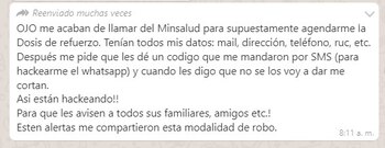 “OJO me acaban de llamar del Minsalud para supuestamente agendarme la dosis de refuerzo. Tenían todos mis datos: mail, dirección, teléfono, ruc, etc. Después me pide que les dé un código que me mandaron por SMS (para hackear el whatsapp) y cuando les digo que no se los voy a dar me cortan. ¡Así están hackeando!! Para que les avisen a todos sus familiares, amigos etc.! Estén alertas, me compartieron esta modalidad de robo”, indica el mensaje.