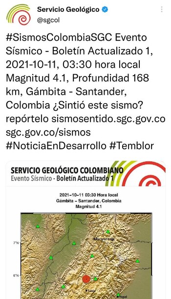 El Servicio Geológico Colombiano, dio a conocer que en la madrigada de este lunes 11 de octubre, en el país se registraron dos movimientos telúricos. La entidad confirmó que los sismos se dieron en el municipio de Yalí, departamento de Antioquia y en Gámbita, departamento de Santander, conalgunas horas de diferencia.