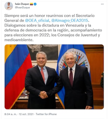 Durante el cumplimiento de su agenda por norteamérica, Iván Duque tuvo un encuentro en la OEA con Luis Almagro, donde hablaron de la crisis que vive Venezuela y cómo está ha afectado la economía de la región, tras la fuerte ola de migrantes que han abandonado el país, y cómo se han visto nulas las relaciones entre Colombia y el país vecino.