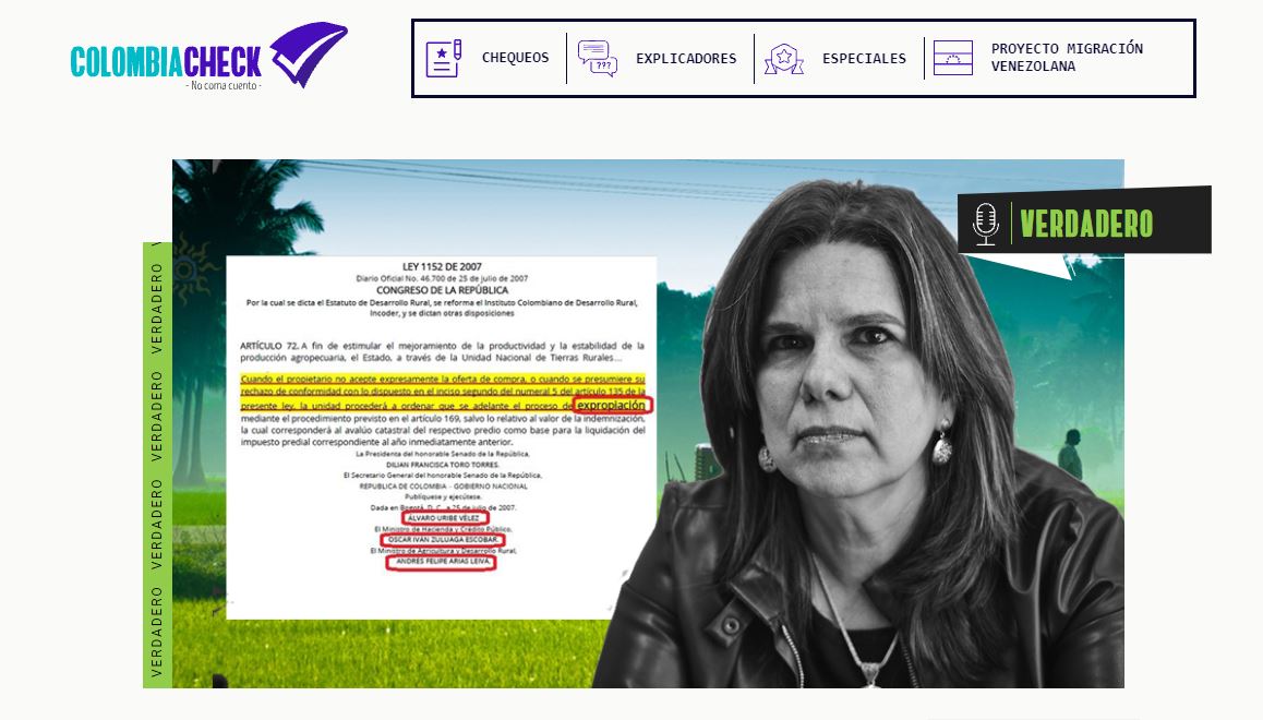 En 2018, Colombia Check, el portal que verifica noticias en internet, calificó de verdadero lo que se compartía en redes sociales sobre que Uribe promovió una ley para expropiar tierras improductivas.