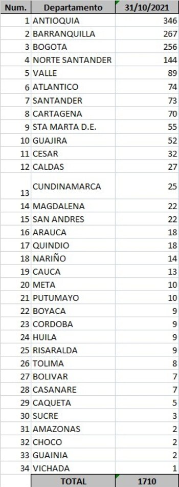 En cuanto a las regiones con más casos reportados, Antioquia lidera con 346 contagiados, seguido de Barranquilla con 267 y en tercer lugar Bogotá con 256.