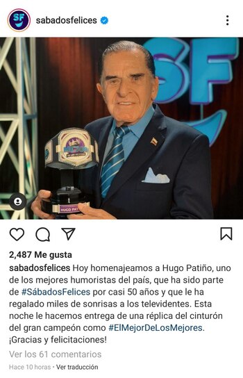 Es clave mencionar que durante el primer enfrentamiento que se dio en el nuevo cuadrilátero de ‘Sábados felices’, César Corredor y el grupo Salpicón se midieron el pulso como figuras de la comedia. Además, hubo un momento bastante emotivo en el que se decidió homenajear a Hugo Patiño, quien ha dedicado casi 50 de sus 91 años de vida al humor.