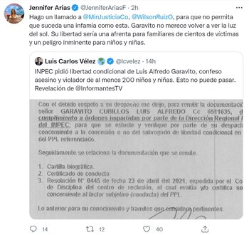 “Hago un llamado al Ministerio de Justicia, Wilson Ruiz, para que no permita que suceda una infamia como esta. Garavito no merece volver a ver la luz del sol. Su libertad sería una afrenta para familiares de cientos de víctimas y un peligro inminente para niños y niñas”, escribió la congresista en sus redes sociales.