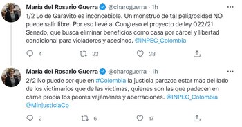 “Lo de Garavito es inconcebible. Un monstruo de tal peligrosidad NO puede salir libre. No puede ser que en Colombia la justicia parezca estar más del lado de los victimarios que de las víctimas, quienes son las que padecen en carne propia los peores vejámenes y aberraciones”, escribió Guerra en Twitter.