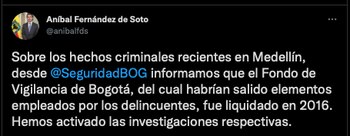 A través de Twitter, el secretario de Seguridad de Bogotá, Aníbal Fernández de Soto, aclaró que el Fondo de Vigilancia del que salieron los chalecos fue liquidado en 2016, pero que aún así, iniciaron las investigaciones respectivas para entender el por qué los elementos terminaron en manos de la delincuencia común.