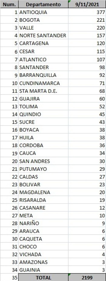 En cuanto a las regiones con más casos reportados, Antioquia lidera con 377 contagiados, seguido de Bogotá con 221 y en tercer lugar Valle con 220.
