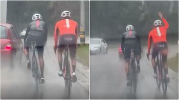 El ciclista del Ineos Grenadiers, que se da cuenta del auto que viene junto a su acompañante, logran hacer una ligera maniobra evasiva con el objetivo de evitar ser tocados por el conductor y posteriormente le increpan por las manos. Por fortuna, el episodio no pasó a mayores para ninguno de los involucrados.