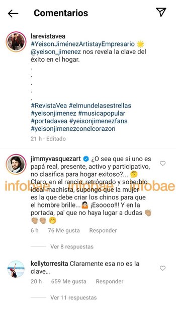 “Tienes razón, esa no es la clave del éxito en un hogar”, “esos dizque padres de hoy en día son así”, “la culpa no solo es de él por decir eso, sino de la revista por compartirlo y darle luz en la portada” y “estas publicaciones definitivamente son el colmo”; fueron algunos de los comentarios que recibió el intérprete de ‘Tu amante’ y ‘No te voy a perdonar’.