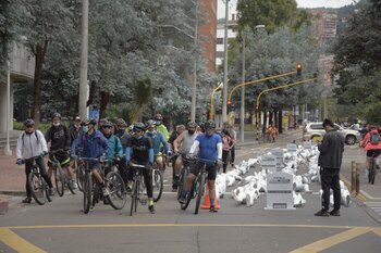 Este domingo, en el tramo de la carrera Séptima entre calles 74 y 76 en el norte de Bogotá, los usuarios de la ciclovía capitalina encontraron un montón de maniquíes blancos tirados sobre el asfalto y lápidas con nombres junto al tipo de vehículos que utilizaban cuando murieron en un accidente de tránsito. El objetivo de esta intervención era llamar la atención sobre las vidas humanas que se pierden en las calles y carreteras colombianas. En su mayoría, de los actores más vulnerables.