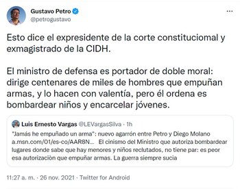 “Esto dice el expresidente de la corte constitucional y exmagistrado de la CIDH. El ministro de defensa es portador de doble moral: dirige centenares de miles de hombres que empuñan armas, y lo hacen con valentía, pero él ordena es bombardear niños y encarcelar jóvenes”, aseveró el senador Petro.