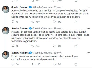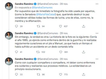 A través de un hilo en su perfil de Twitter, la exguerrillera y ahora senadora también compartió la foto y señaló que esta “ha sido usada por aquellos, como la senadora María Fernanda Cabal, que queriendo destruir la paz consideran válidas todas las formas de lucha, una de ellas, como no, la mentira y difamación”.