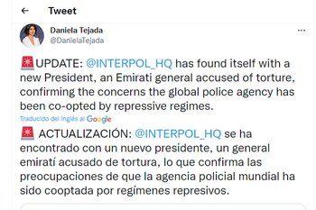 Por su parte, su esposa Daniela Tejada también reaccionó a la noticia diciendo que “Interpol se ha encontrado con un nuevo presidente, un general emiratí acusado de tortura, lo que confirma las preocupaciones de que la agencia policial mundial ha sido cooptada por regímenes represivos”.