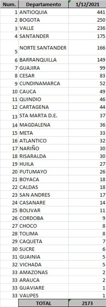 El Ministerio de Salud y Protección Social reportó, este miércoles 1 de diciembre, 2.173 casos nuevos de covid-19 en Colombia. En las últimas 24 horas se procesaron 47.993 pruebas de las cuales 21.935 son PCR y 26.058 de antígenos.