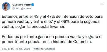 Estos resultados le dieron al líder de la Colombia Humana un impulso en sus expectativas, incluso para descartar una segunda vuelta. “Estamos entre el 43 y el 47% de intención de voto para primera vuelta, y entre el 57 y el 68% para la segunda vuelta, según la encuesta Invamer. Podemos por tanto ganar en primera vuelta y lograra el primer triunfo popular en la historia de Colombia”, señaló el candidato presidencial del Pacto Histórico.
