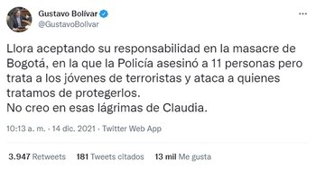 “Llora aceptando su responsabilidad en la masacre de Bogotá, en la que la Policía asesinó a 11 personas pero trata a los jóvenes de terroristas y ataca a quienes tratamos de protegerlos. No creo en esas lágrimas de Claudia”, escribió en candidato a cabeza de lista del Pacto Histórico para el Senado.