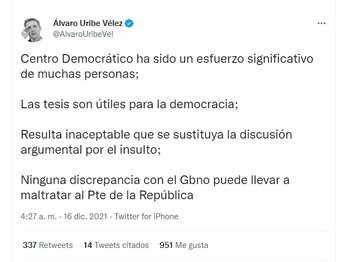 “Centro Democrático ha sido un esfuerzo significativo de muchas personas; las tesis son útiles para la democracia. Resulta inaceptable que se sustituya la discusión argumental por el insulto; ninguna discrepancia con el Gobierno puede llevar a maltratar al Presiente de la República”, escribió el exmandatario en su perfil de Twitter el pasado 16 de diciembre.