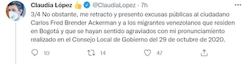 “No obstante, me retracto y presento excusas públicas al ciudadano Carlos Fred Brender Ackerman y a los migrantes venezolanos que residen en Bogotá y que se hayan sentido agraviados con mi pronunciamiento realizado en el Consejo Local de Gobierno del 29 de octubre de 2020″, concluyó López asegurando que Bogotá es la “más generosa” en cuanto a la atención de la población venezolana migrante.
