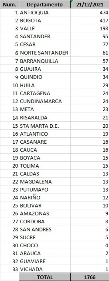 El Ministerio de Salud y Protección Social reportó, este martes 21 de diciembre, 1.766 casos nuevos de covid-19 en Colombia. En las últimas 24 horas se procesaron 48.415 pruebas de las cuales 23.004 son PCR y 25..411 de antígenos.