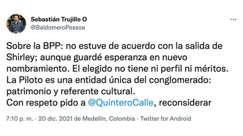 “Sobre la BPP: no estuve de acuerdo con la salida de Shirley; aunque guardé esperanza en nuevo nombramiento. El elegido no tiene ni perfil ni méritos. La Piloto es una entidad única del conglomerado: patrimonio y referente cultural. Con respeto pido a @QuinteroCalle, reconsiderar”, escribió el funcionario en su cuenta de Twitter.