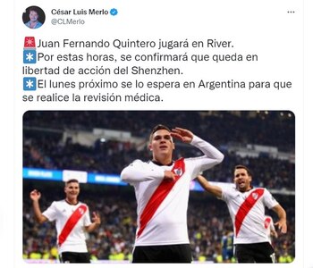 Acerca del fichaje del ‘10′, Merlo publicó en su cuenta en Twitter: “Juan Fernando Quintero jugará en River. Por estas horas, se confirmará que queda en libertad de acción del Shenzhen. El lunes próximo se lo espera en Argentina para que se realice la revisión médica”.