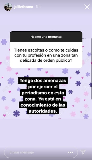 Esta compleja situación, que fue noticia en varios portales informativos del país, hizo que Cano sumara todavía más seguidores en sus redes sociales, a través de las cuales sorprendió en horas recientes al informar que ha sido amenazada de muerte en varias ocasiones por la labor que desempeña en esta zona del Norte de Santander.
