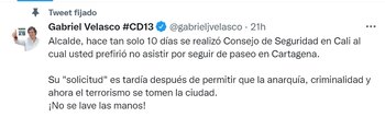 A través de su cuenta de Twitter, el congresista le recordó al Jorge Iván Ospina que, 10 días atrás, se había realizado un consejo de seguridad en Cali al que, de acuerdo con Velasco, el burgomaestre decidió no asistir por “seguir de paso en Cartagena”, por lo que el senador le aseguró al mandatario local que su propuesta era ya no tenía cabida.