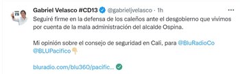 Horas después, por medio de la misma red social, el congresista compartió un artículo de la emisora Blu Radio sobre el alcalde de Cali, a lo que reiteró que se mantendrá “firme en la defensa de los caleños ante el desgobierno que vivimos por cuenta de la mala administración del alcalde Ospina.”