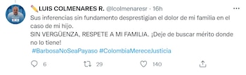 En trinos posteriores al video compartido, el padre de Luis Andrés Colmenares también le pidió al fiscal Barbosa respetar el dolor de su familia y no usar el caso de su hijo para buscar méritos que no merece.