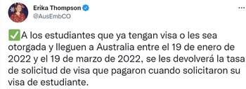El anuncio fue confirmado por la embajadora de Australia en Colombia y Venezuela, Erika Thompson, a través de su cuenta de Twitter, quien precisó: “A los estudiantes que ya tengan visa o les sea otorgada y lleguen a Australia entre el 19 de enero de 2022 y el 19 de marzo de 2022, se les devolverá la tasa de solicitud de visa que pagaron cuando solicitaron su visa de estudiante”.
