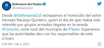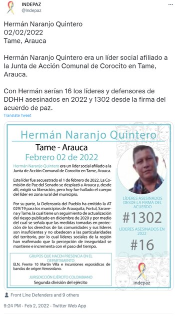 La ONG Indepaz, también a través de su cuenta de Twitter, confirmó el asesinato del líder comunal y escribió: “Herman Naranjo Quintero era un líder social afiliado a la Junta de Acción Comunal de Corocito en Tame, Arauca. Con Herman serían 16 los líderes y defensores de DDHH asesinados en 2022 y 1302 desde la firma del acuerdo de paz”.