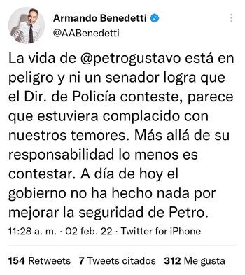 Para finalizar, el director de la UNP citó el trino del senador Armando Benedetti y concluyó que la seguridad de precandidato Gustavo Petro, “se ha atendido de manera diligente, prioritaria y directa con el propio candidato y su campaña”.