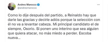 Andrés Marocco, periodista de ESPN, fue uno de los que hizo evidente su gusto por Juan Carlos Osorio como un eventual timonel de la selección Colombia. En su cuenta en Twitter publicó: “Como lo dije después del partido, a Reinaldo hay que darle las gracias y decirle adiós porque la selección con él no va a levantar cabeza. Mi principal candidato el de siempre, Osorio. Si ponen uno interino que sea alguien que quiera atacar, no más miedo a perder. Escoba nueva…”.