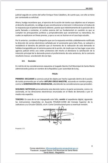El Juzgado Quinto Civil de Santa Marta negó la acción de tutela presentada por Arturo Creus, único testigo presencial en el caso de Enrique Vives Caballero, con la que buscaba que la Gobernación de Magdalena le pagara la recompensa ofrecida por su testimonio.