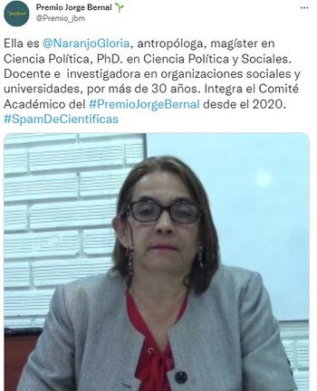 4. Ella es @NaranjoGloria, antropóloga, magíster en Ciencia Política, PhD. en Ciencia Política y Sociales. Docente e investigadora en organizaciones sociales y universidades, por más de 30 años. Integra el Comité Académico del #PremioJorgeBernal desde el 2020. #SpamDeCientificas.