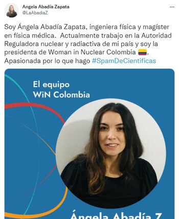 2. Soy Ángela Abadía Zapata, ingeniera física y magíster en física médica. Actualmente trabajo en la Autoridad Reguladora nuclear y radiactiva de mi país y soy la presidenta de Woman in Nuclear Colombia. Apasionada por lo que hago #SpamDeCientificas.