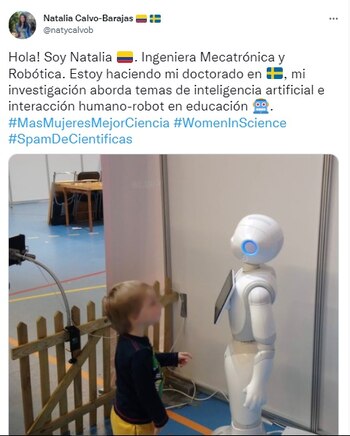 1. Hola! Soy Natalia Ingeniera Mecatrónica y Robótica. Estoy haciendo mi doctorado en Suecia, mi investigación aborda temas de inteligencia artificial e interacción humano-robot en educación. #MasMujeresMejorCiencia #WomenInScience #SpamDeCientificas.