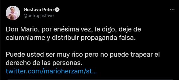 El empresario Mario Hernández publicó este 16 de febrero una noticia falsa sobre el candidato presidencial Gustavo Petro, por lo que el líder del Pacto Histórico se defendió y le pidió que dejara de calumniarlo, como en otras ocasiones.