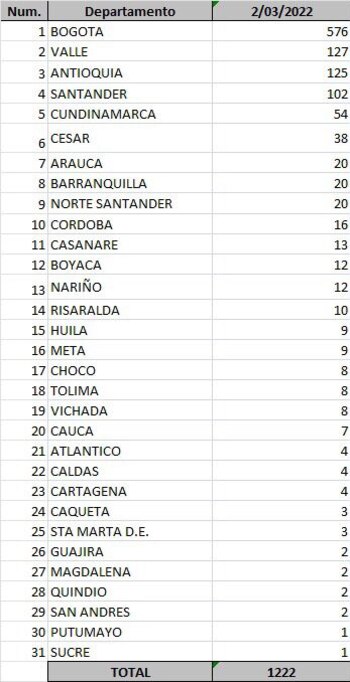 El Ministerio de Salud reportó, este miércoles 2 de marzo de 2022, 1.222 casos nuevos de covid-19 en Colombia. En las últimas 24 horas se procesaron 26.193 pruebas de las cuales 8.436 son PCR y 17.757 de antígenos.