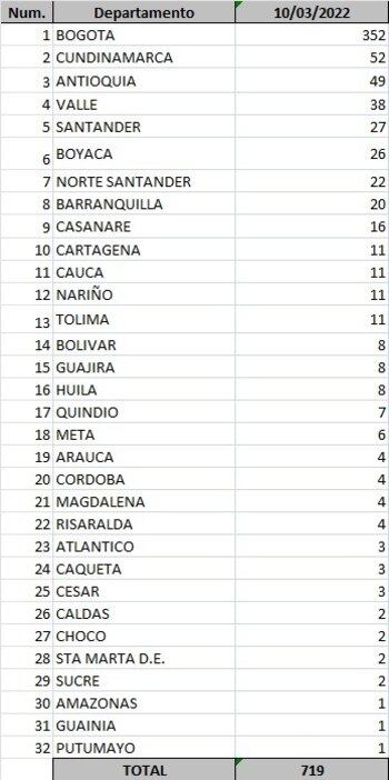 En cuanto a las regiones con más casos reportados, Bogotá lidera con 352 contagiados, seguido de Cundinamarca con 52 contagios y en tercer lugar Antioquia con 49.