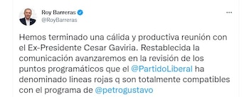Por su parte, a través de su cuenta de Twitter, Roy Barreras dio detalles de su reunión con el exjefe de Estado. “Hemos terminado una cálida y productiva reunión con el Ex-Presidente César Gaviria”, dijo Barreras, a su vez que dio a conocer los temas abordados con él.